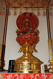 中央の仏間、煌びやかな荘厳「羅網」の向こう側に、静かに鎮座されているのが当山鎮守の「愛染明王様」です。