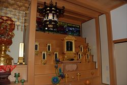 この永代位牌堂「新愛染明王堂」の荘厳は、左壇・右壇の上段の奥が、ステンドグラスとなっています。