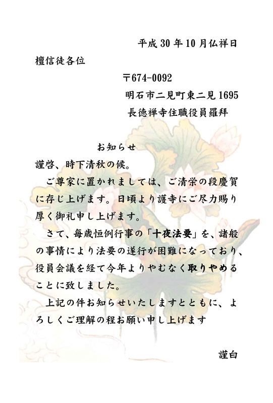毎歳恒例行事の「十夜法要」は、諸般の事情により法要の遂行が困難になっており、役員会議を経て、平成30年よりやむなく取りやめることになりました。